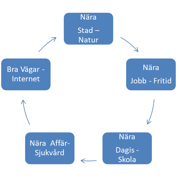 De olika aspekterna har olika vikt under en livstid. När barnen är små är man faktiskt beroende av att inte ha alltför långt till dagis och skolor. En annan faktor är att barnen har kompisar i närområdet. Om man inte har barn eller när barnen är vuxna finns inte de aspekterna.