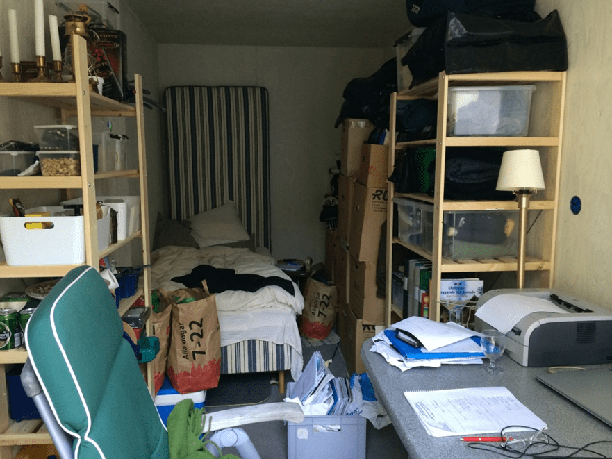 Jag bodde på vandrar hem, hos en vän, i byggbaracken och sista tiden i mitt 14 kvm stora förråd tillsammans med 10 flyttkartonger. Det var inget lyxliv!